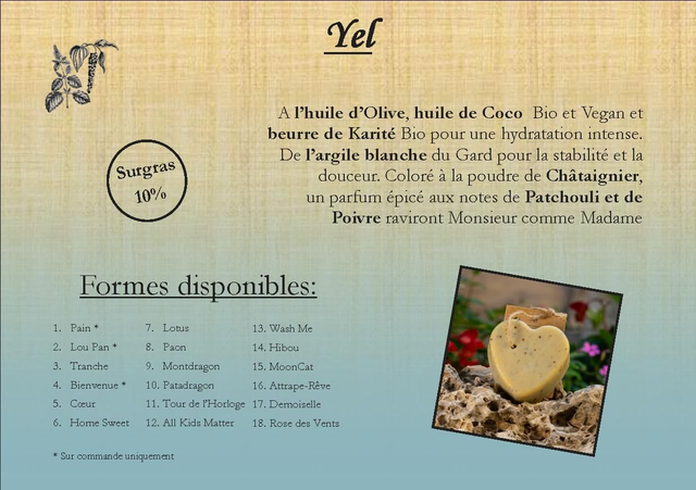 Huile d’olive¤, eau¤, huile de coco*, hydroxyde de sodium, beurre de karité*, argile blanche¤, parfum¤, poudre de châtaignier.